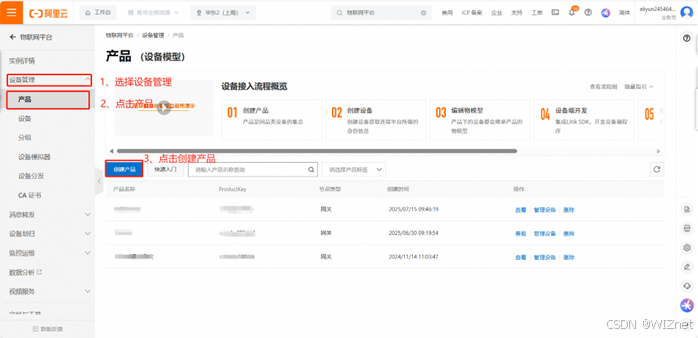 选择设备管理 → 点击产品 → 点击创建产品