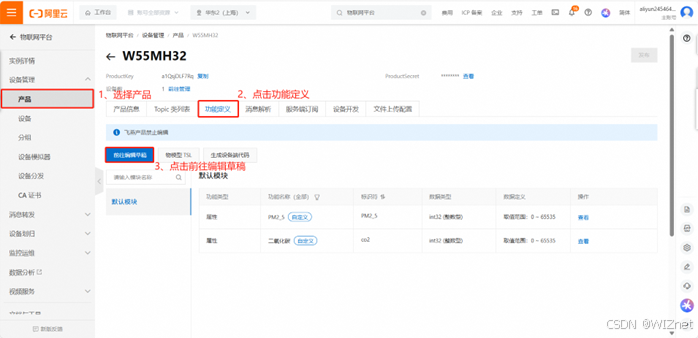 定义物联网模型,选择产品 → 点击功能定义 → 点击前往编辑草稿