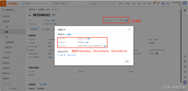 点击查看DeviceSecret,获取到设备证书