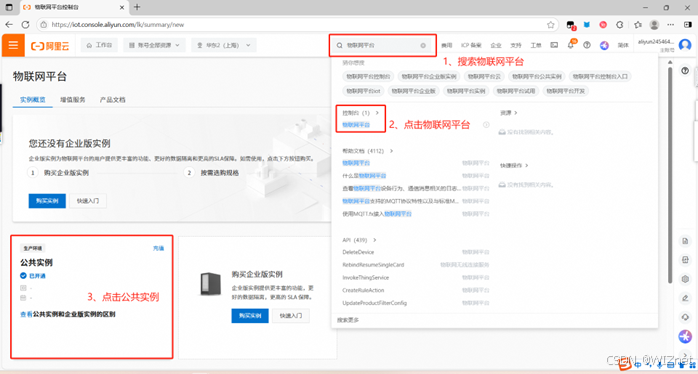 搜索物联网平台 → 点击物联网平台 → 点击公共实例