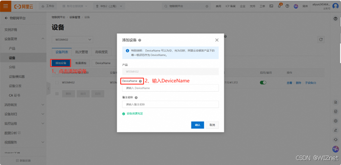 创建成功产品后点击添加设备 → 输入DeviceName