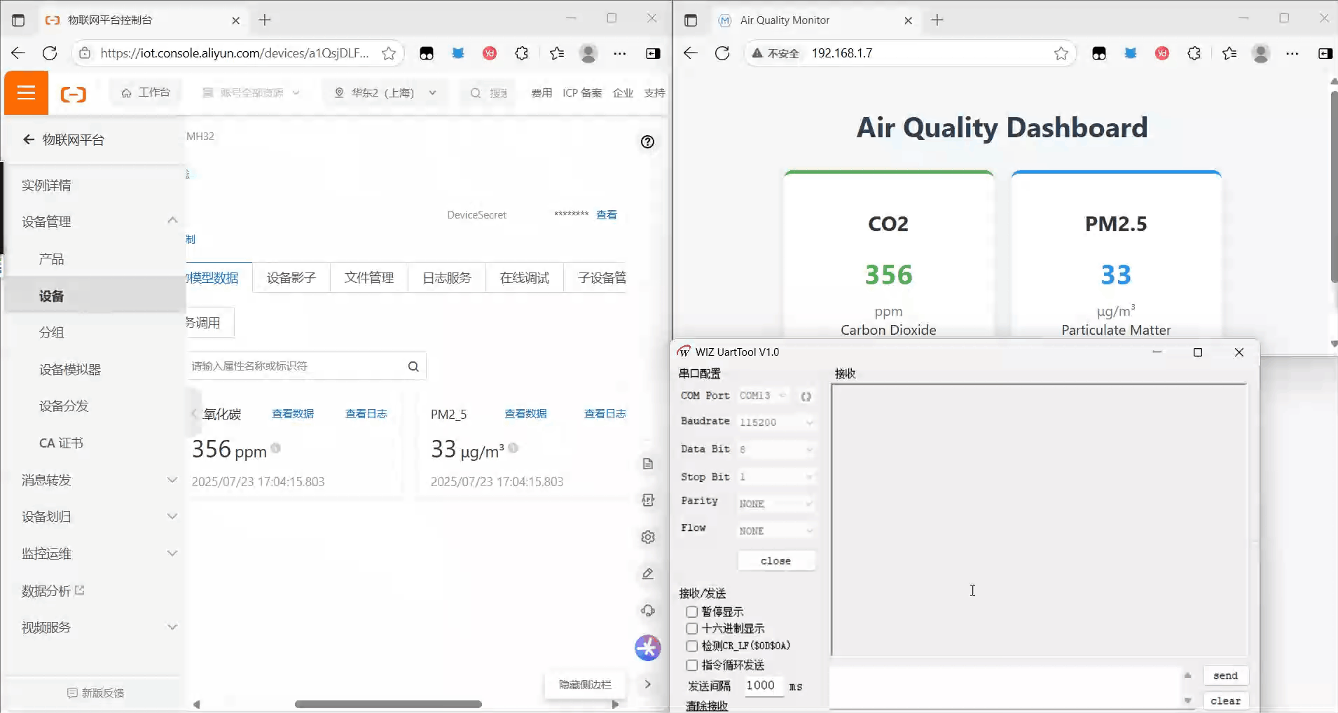 基于以上,我决定动手搞这个项目:本项目以W55MH32 以太网开发板为核心,通过JW01-CO2传感器(实时监测二氧化碳浓度)与DC01红外PM2.5传感器(精准检测空气中细颗粒物含量),构建了一套智能化环境监测解决方案。系统通过MQTT协议与阿里云物联网平台建立稳定通信链路,实现监测数据的云端远程传输、存储与分析,支持用户通过移动端或Web端实时查看数据历史趋势与告警信息。 创新性地开发了本地实时数据可视化网页,设备内置轻量级Web服务器,用户可直接通过浏览器访问设备IP地址,获取传感器数据的动态刷新显示(5秒更新一次)。最终达到让“看不见”的空气变得“看得见、摸得着、管得住”,用数据指导生活,呼吸得更明白、更健康!