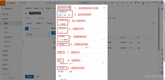 点击添加自定义功能 → 选择功能类型 → 输入功能名称 → 设置标识符 → 设置数据类型 → 设置取值范围 → 设置步长 → 设置单位 → 设置读写类型