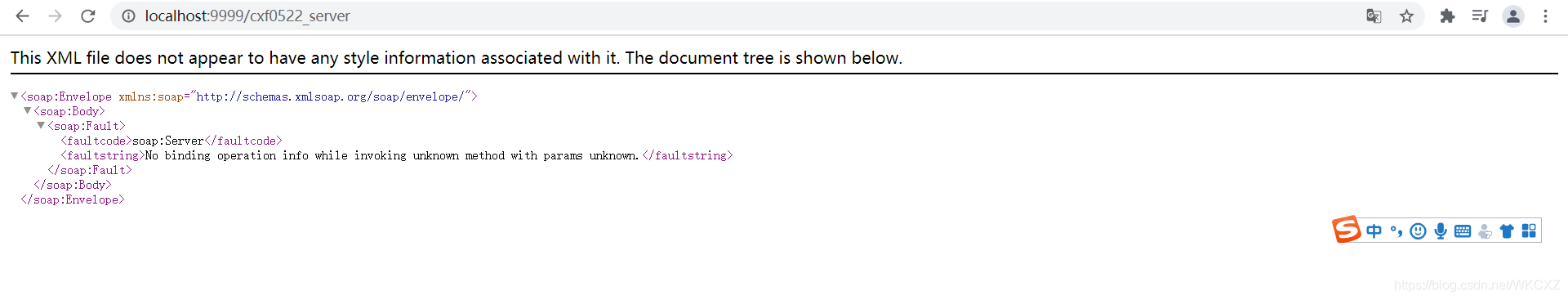 原因是,使用浏览器访问WebService接口时,访问链接末尾没有加“?WSDL”,例如:http://localhost:9999/cxf0522_server?WSDL