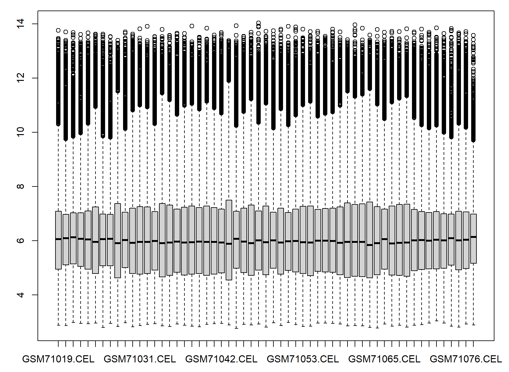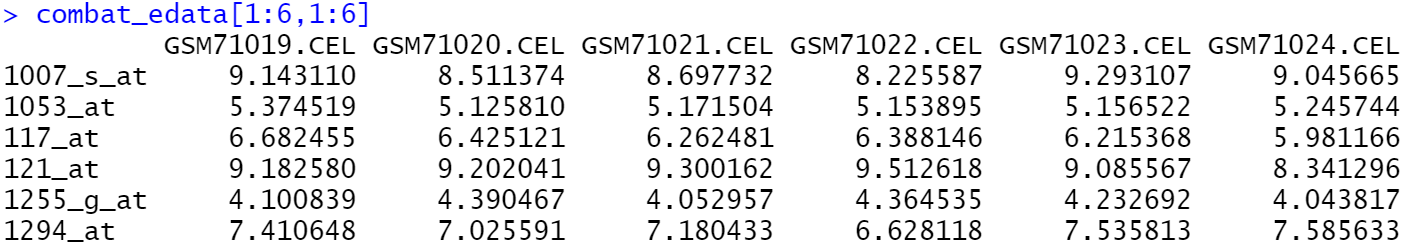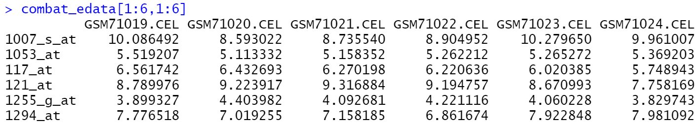 combat_edata = ComBat(dat=edata, batch=batch, mod=NULL, par.prior=TRUE, prior.plots=F)