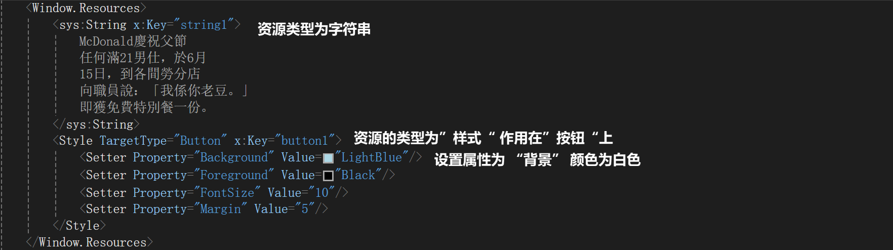 字典以 键-值对形式存储资源,即x:Key="string1" 可以理解为这个字符串资源的名字叫做string1