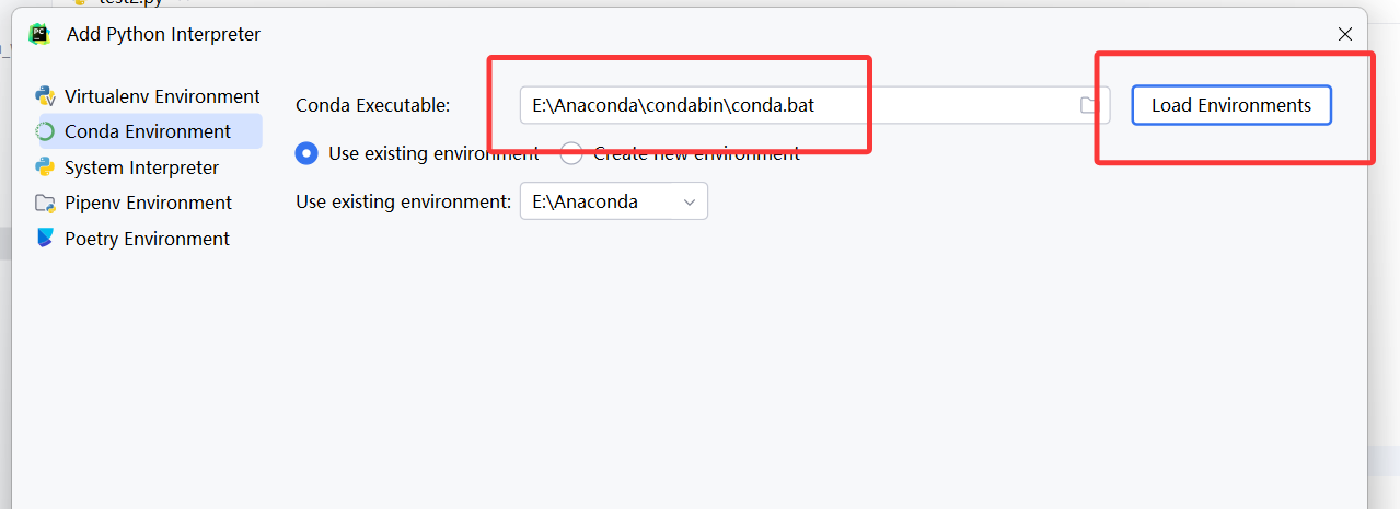 选择conda.bat,然后选择下面的使用python环境,使用底下的:use existing environment的便可以选择环境