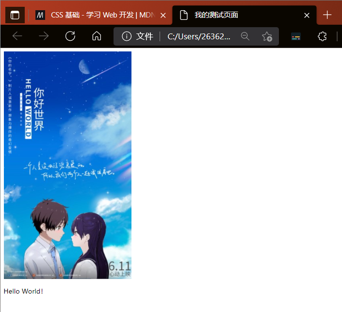 <img src="" alt="我的测试页面">是在页面里插入图像的 HTML 代码。我们需要告诉 HTML 图像的位置。这张图片在 images 目录下_,_而 images 目录与index.html处于同级目录。要从index.html所处一级目录进入图片所在目录。例如,这里的图像叫做helloworld.png,所以文件路径就是images/helloworld.png。 -
