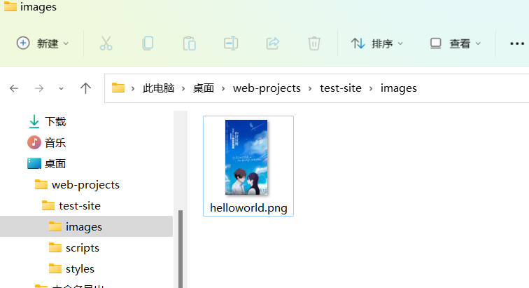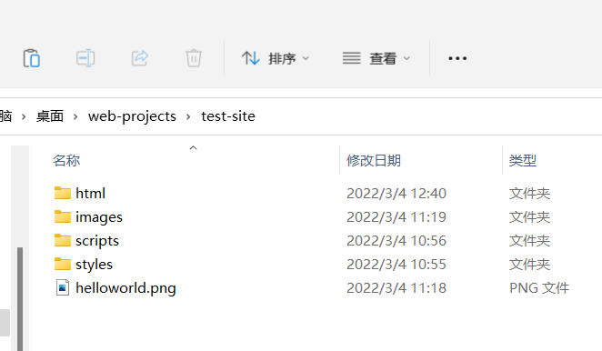 images:这个文件夹包含站点中的所有图像。在test-site文件夹中新建images文件夹。 - 样式表文件夹