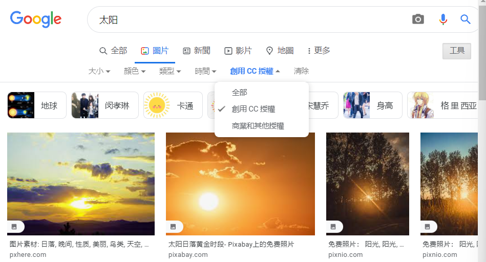 请注意大多数网络图片(包括 Google 图片)都是受版权保护的。为了降低盗版风险,可以使用“Google 许可证过滤器”。点击“工具”按钮,然后在使用权限的选项下选择类似“启用CC授权”的选项: