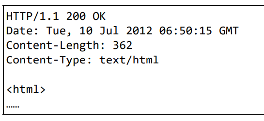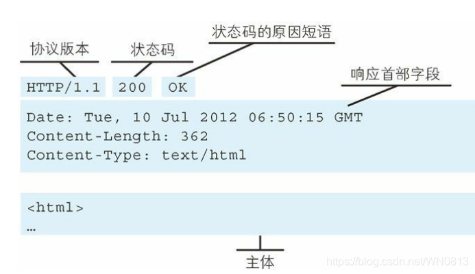 在起始行开头的HTTP/1.1表示服务器对应的HTTP版本,200 OK表示请求的处理结果的状态码和原因短语。下一行显示了创建响应的日期时间,是首部字段内的一个属性,接着以一空行分隔,之后的内容称为资源实体的主体