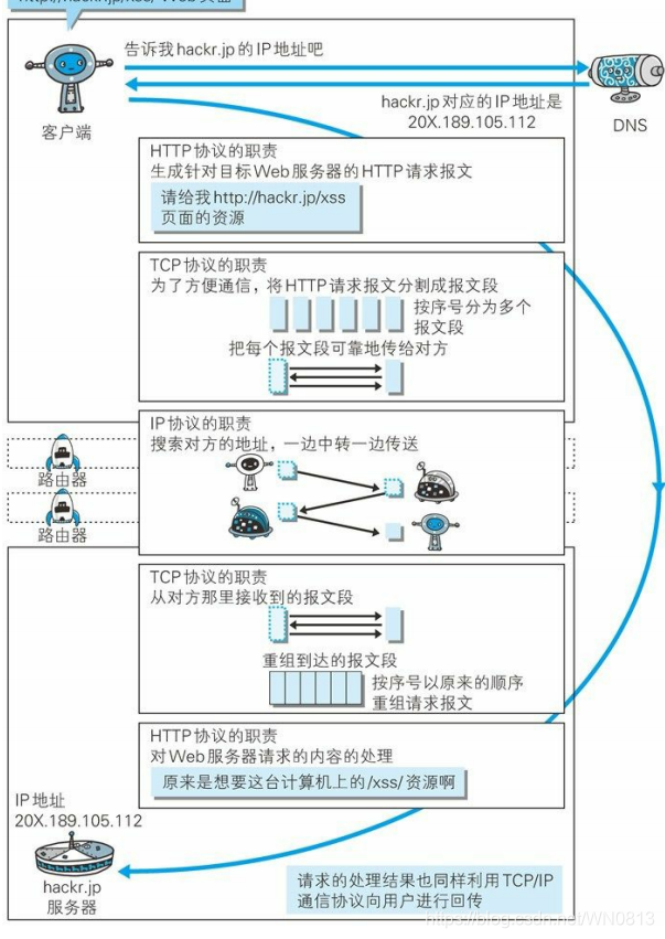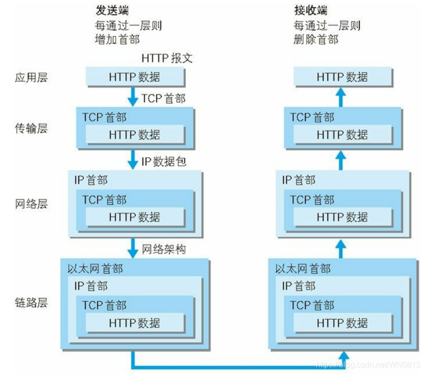 举例HTTP:首先作为发送端的客户端在应用层发出一个想看某个Web页面的HTTP请求接着为了传输方便,在传输层(TCP协议)把从应用层收到的数据(HTTP请求报文)进行分割,并在各个报文上打上标记序号及端口号后转发给网络层;在协议层(IP协议),增加作为通信目的的MAC地址后转发给链路层;接收端的服务器在链路层接收到数据,按序往上发送,一直到应用层。传送到应用层才算真正接收到由客户端发送过来的HTTP请求