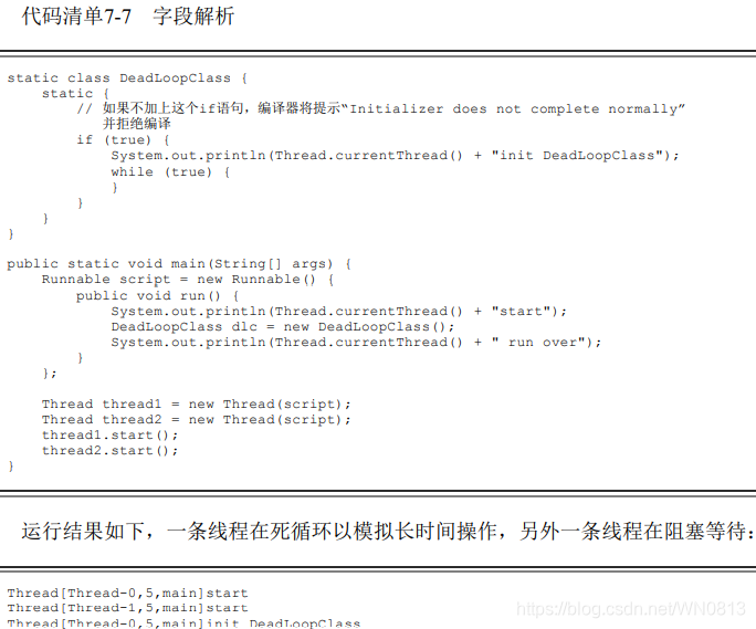 JVM必须保证一个类的<clinit>()方法在多线程环境中被正确地加锁同步,如果多个线程同时去初始化一个类,那只会有其中一个线程去执行这个类的<clinit>()方法,其他线程都需要阻塞等待,直到活动线程执行完毕<clinit>()方法