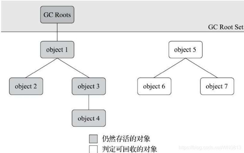 通过一系列称为“GCRoots”的根对象作为起始节点集,根据引用关系向下搜索,如果某个对象到GCRoots间没有任何引用链相连,证明此对象不能再被使用