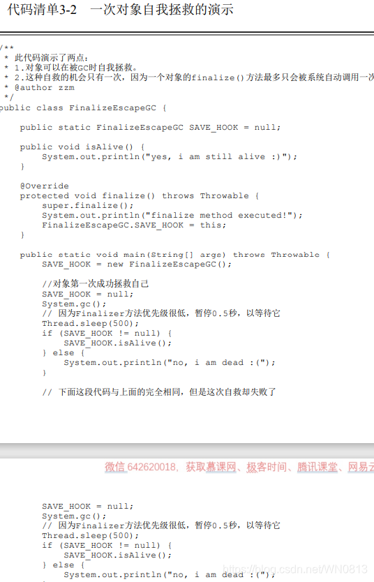 真正宣告一个对象死亡,至少要经历两个标记过程:如果对象在进行可达性分析后发现没有与GCRoots相连接的引用链,那它将会被第一次标记,随后进行一次筛选,筛选的条件是此对象是否有必要执行finalize()方法。假设对象没有覆盖finalize()方法,或finalize()方法已被JVM调用过,那JVM将这两种情况视作“没有必要执行”;若被判定为确有必要执行finalize()方法,那么该对象将会被放置在一个名为F-Queue的列队之中,并在稍后有一条由JVM自动建立的、低调度优先级的Finalizer线程去执行它们的finalized()方法