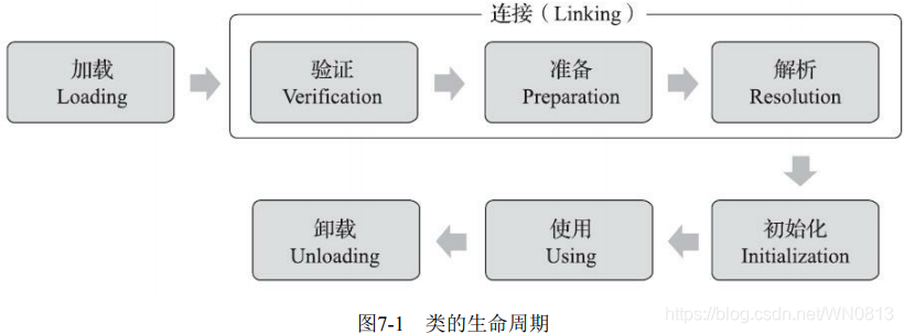 一个类型从被加载到JVM内存中开始,到卸载出内存为止,整个生命周期经历了加载、验证、准备、解析、初始化、使用、卸载7个阶段,其中验证、准备、解析统称为连接。解析在某些情况下可以在初始化阶段之后再开始,是为了支持Java语言的运行时绑定特性