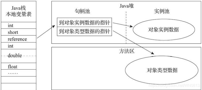 如果使用句柄访问的化,Java堆中将可能会划出一块内存来作为句柄池,reference中存储的就是对象的句柄地址,而句柄中包含了对象实例数据与类型数据各自具体的地址信息 好处:reference存储的是稳定句柄地址,reference本身不需修改