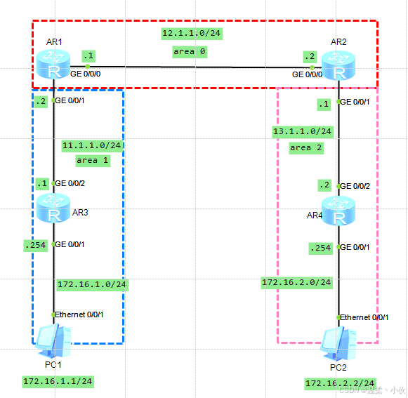 - 本实验基于eNSP1.3.00.100,合理划分area区域,核心控制设备为路由器AR1/AR2/AR3/AR4。