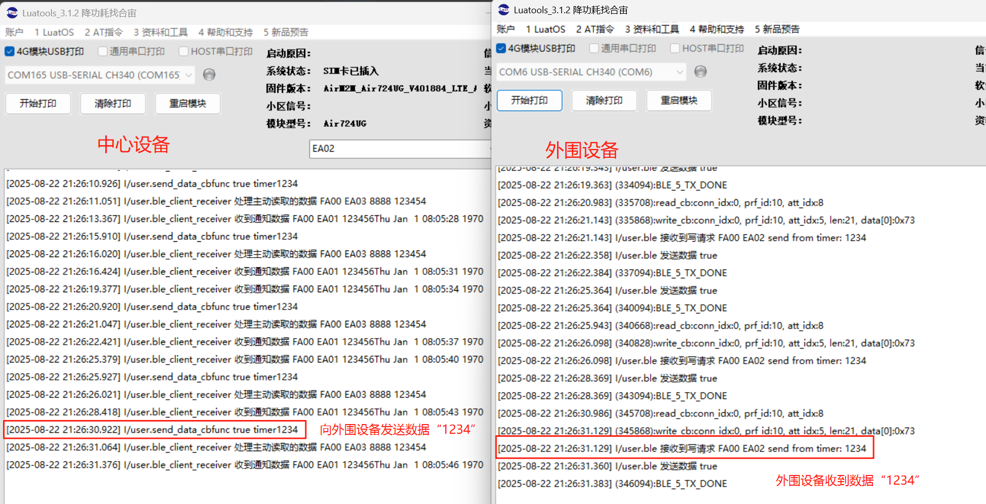 本示例使用两个 Air8000 核心板来演示 BLE 中心设备模式:一个核心板做中心设备(烧录 central demo),另一个核心板做外围设备(烧录 peripheral demo)。