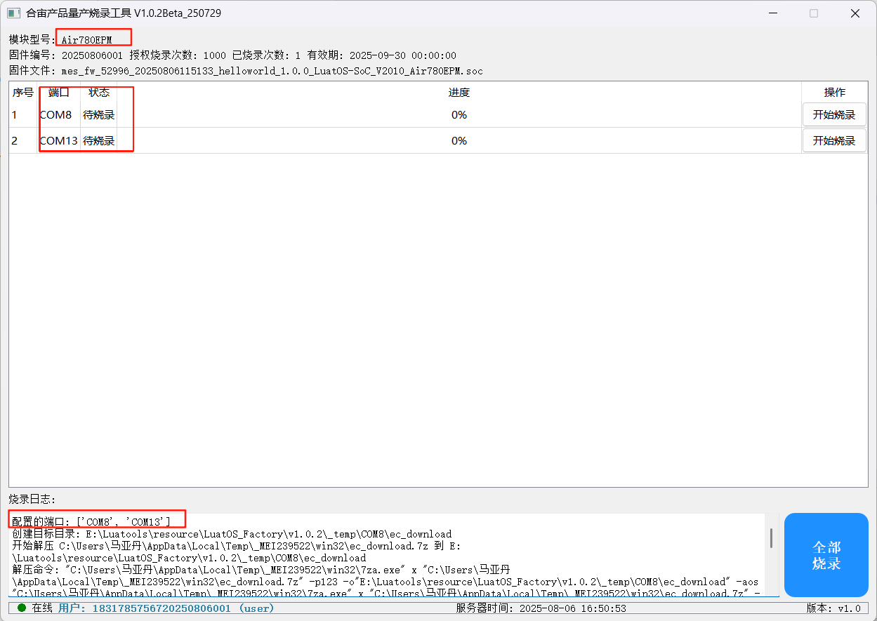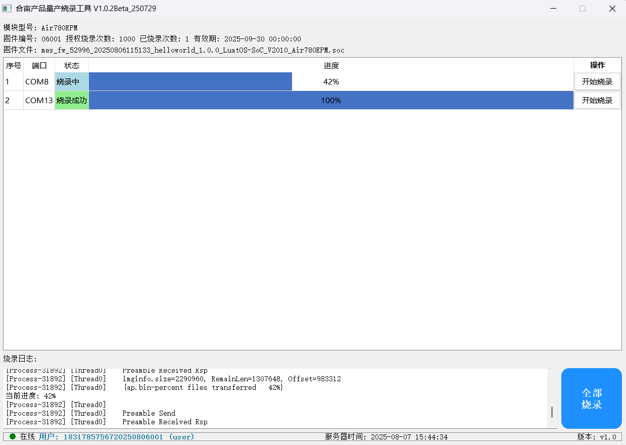 或者点击全部烧录,会烧录当前所有配置好的模组。