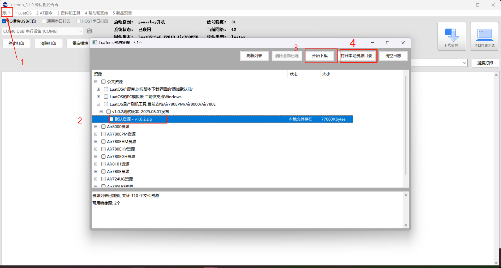 打开 Luatools 工具,右上角找到账户,点击打开资源下载,找到下图所示的路径:公共资源-->LuatOS 量产刷机工具-->v1.0.2 测试版本--> 默认资源,勾选默认资源前的方框,点击下载,下载完成后,点击打开本地资源目录。