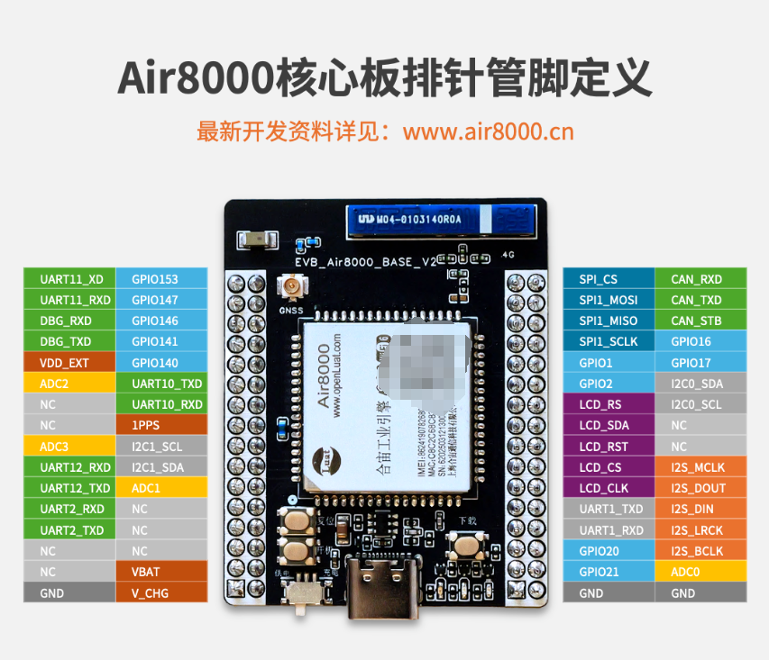 Air8000相关管脚具有复用功能,结合原理图引脚指示可知板载红色LED由PIN24 GPIO21控制。本示例demo中已有配置好的pins_Air8000.json文件,测试demo时一并烧录进Air8000核心板。