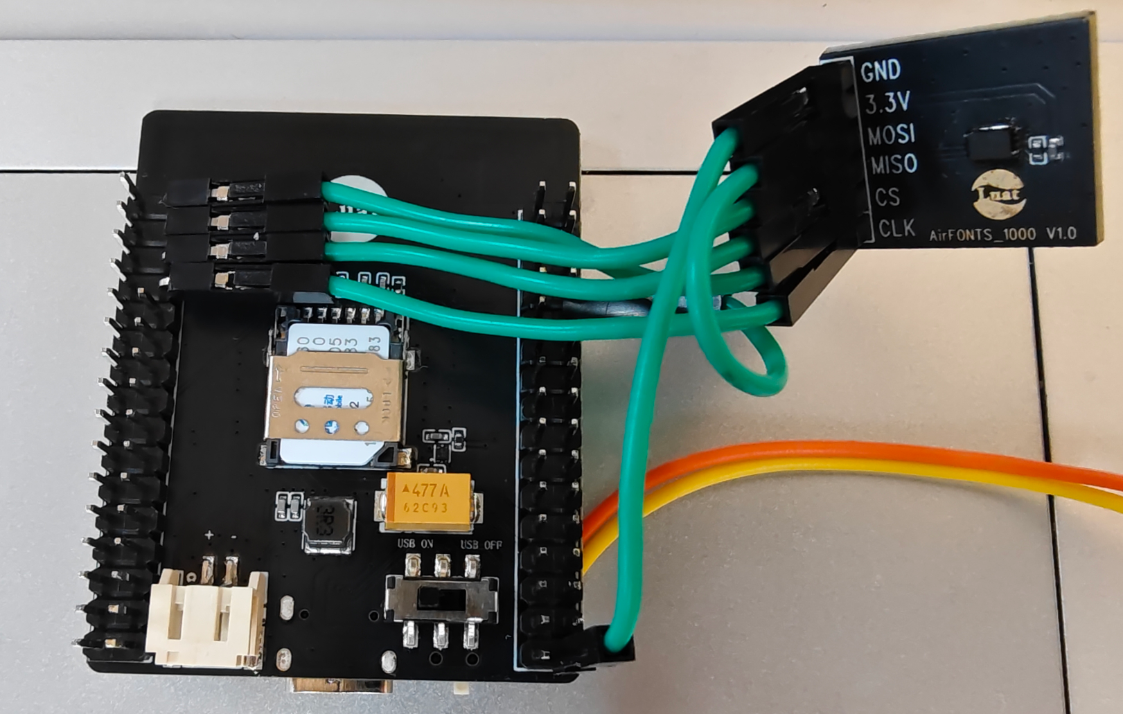 5、Air8000 核心板和 AirFONT_1000 配件板的硬件接线方式为
