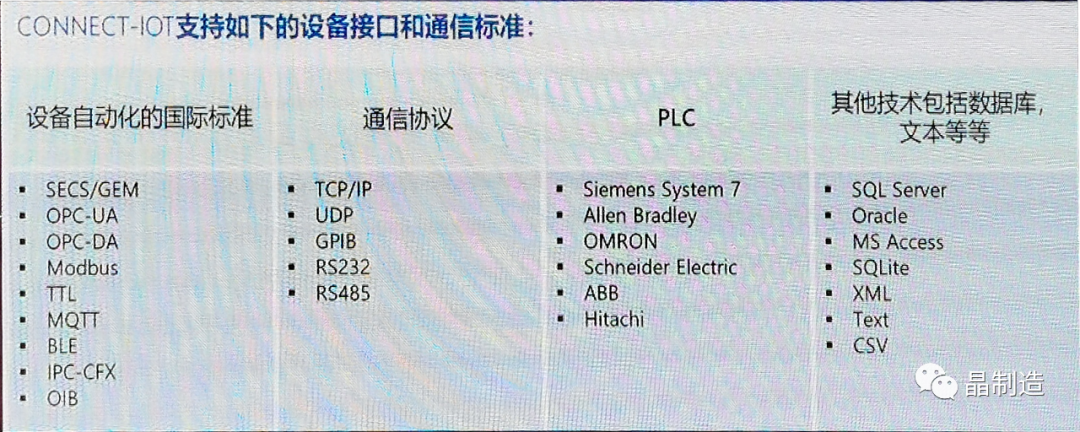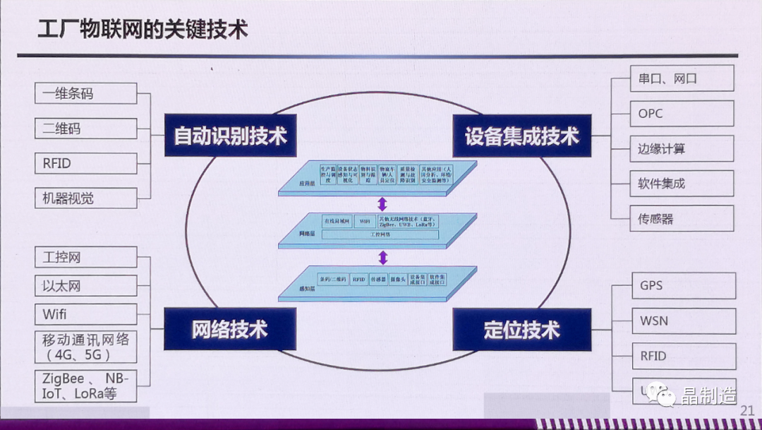 物联网是通过各种信息传感设备按约定的协议将设备与网络连接,以实现对设备的定位、追踪、监测、采集、交互等功能。物联网是实现智能工厂的基础,不同的信息可以通过不同的技术来实现。