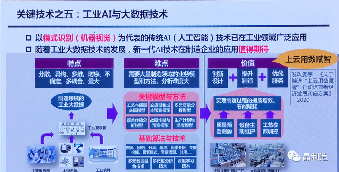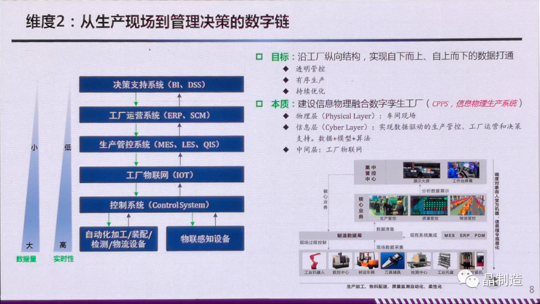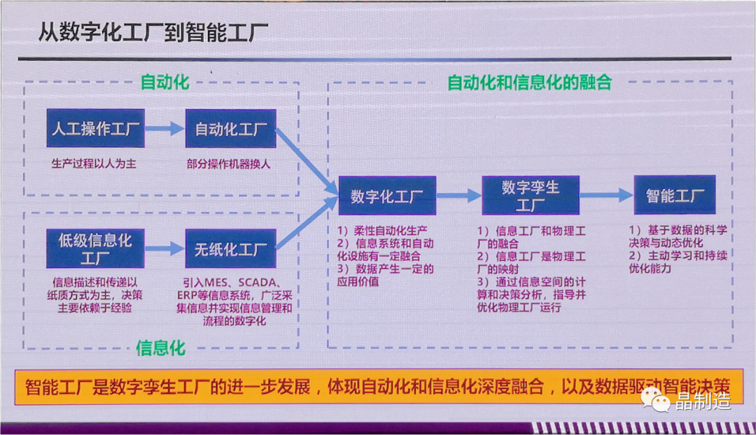 利用自动化和机器人技术实现自动化,通过物联网和信息技术并引入MES、SCADA、ERP系统将信息数字化。结合大数据分析为决策者提供执行依据,搭载人工智能技术实现智能化生产。
