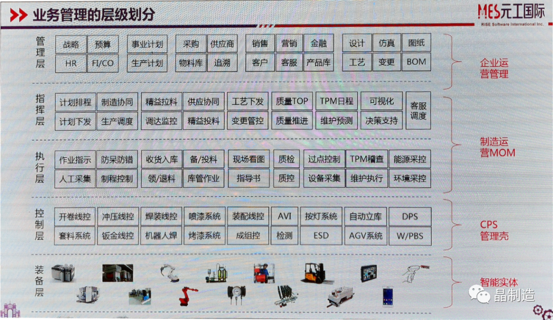 元工国际根据职能将业务划分为管理层、指挥层、执行层、控制层和设备层,将职能明确到层级,搭配相应的系统运营实现智能化生产。