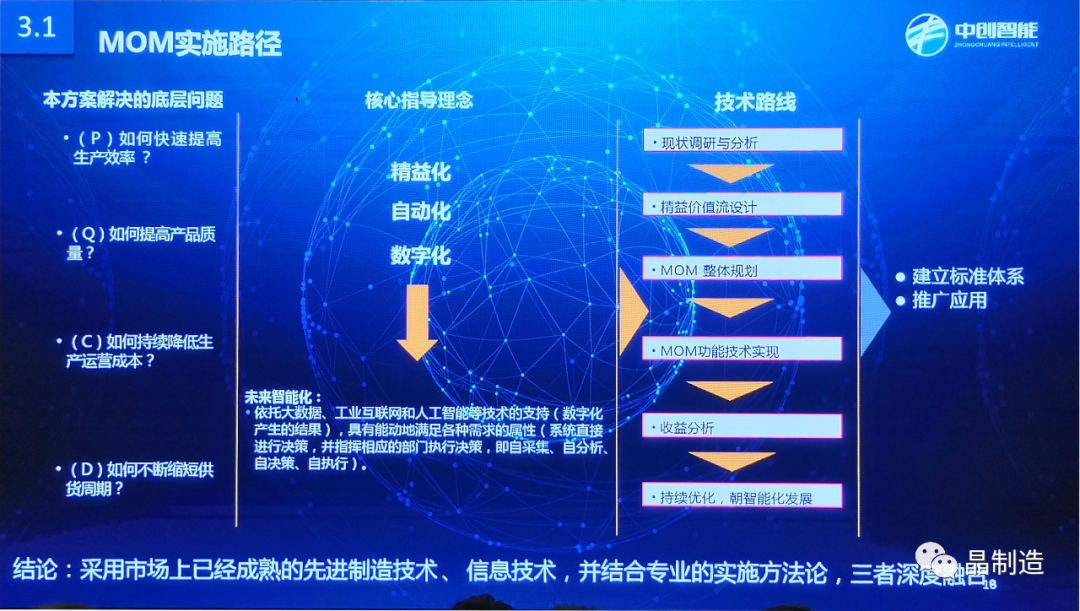 这里的技术路线主要通过现状调研分析提取有价值的数据并设计规划MOM,通过对MOM的技术实现并不断的改进优化,朝智能制造发展。具体如何实现并没有展示出来,没有看出MOM的价值所在!