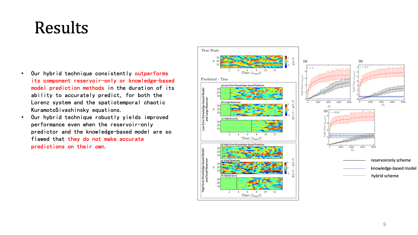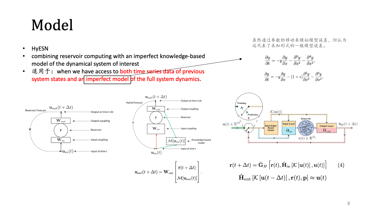 机器学习技术已经证明,在预测混沌系统时,完全根据过去对系统状态变量(训练数据)的时间序列测量,而无需事先了解系统动力学,能得到很有前景的结果,而文章想要填补机器学习在知识方面的空白,所以结合基于知识的模型和机器学习技术来构建混合预测方案。