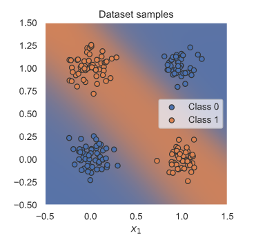 为了可视化模型所学到的内容,可以在范围 [ − 0.5 , 1.5 ] [-0.5, 1.5] [−0.5,1.5] 内对每个数据点进行预测,并像本节开头的示例图那样可视化预测的类别。这将展示模型创建的决策边界,以及哪些点会被分类为 0 0 0,哪些点会被分类为 1 1 1。因此,将得到一个背景图像,其中蓝色(类别 0)和橙色(类别 1)区域分别表示不同的类别。模型不确定的地方会看到模糊的重叠区域。具体的代码与输出图像相比不太重要,而输出图像应该能清晰地显示出类别的分隔: