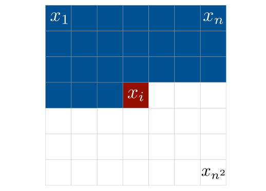 在本课程中,我们将为图像建模任务实现一个自回归似然模型。自回归模型是一类天然强大的生成模型,不仅构成了当前基于似然的图像建模领域的最先进架构之一,也是诸如GPT3等大型语言生成模型的基础。与语言生成类似,自回归模型在图像上的工作原理是:基于所有先前像素来建模某个像素的似然。例如,在下图中,我们将像素 建模为基于所有先前(图中蓝色)像素的条件概率分布: