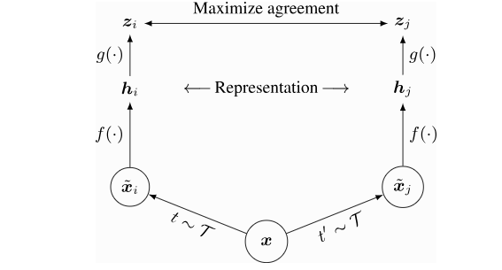 在过去的两年里,针对图像的自监督学习提出了许多新的方法,这些方法在只有少量标签可用时与监督模型相比取得了巨大进步。在本课程中,我们将专注于对比学习这一子领域。对比学习的动机是上面提到的问题:图像之间有什么不同?具体来说,对比学习方法训练模型将图像及其略微增强的版本在潜在空间中聚类,同时最大化与其他图像的距离。一个非常新且简单的方法是 SimCLR,其可视化如下图所示(图片来源于 Ting Chen 等人)。