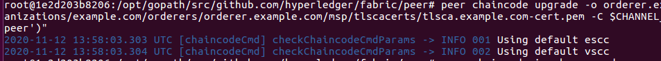 peer chaincode upgrade -o orderer.example.com:7050 --tls --cafile /opt/gopath/src/github.com/hyperledger/fabric/peer/crypto/ordererOrganizations/example.com/orderers/orderer.example.com/msp/tlscacerts/tlsca.example.com-cert.pem -C $CHANNEL_NAME -n mycc -v 12.0 -c '{"Args":["init","a", "100", "b","200"]}' -P "OR ('Org1MSP.peer','Org2MSP.peer')"