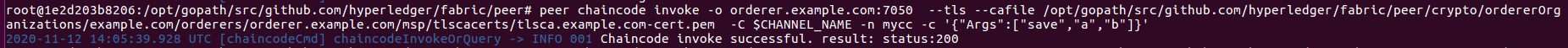 peer chaincode invoke -o orderer.example.com:7050 --tls --cafile /opt/gopath/src/github.com/hyperledger/fabric/peer/crypto/ordererOrganizations/example.com/orderers/orderer.example.com/msp/tlscacerts/tlsca.example.com-cert.pem -C $CHANNEL_NAME -n mycc -c '{"Args":["save","a","b"]}'