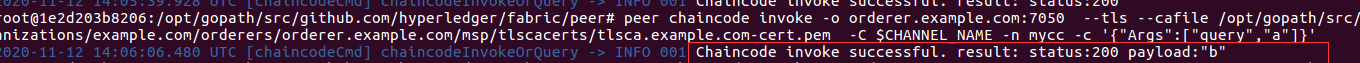 peer chaincode invoke -o orderer.example.com:7050 --tls --cafile /opt/gopath/src/github.com/hyperledger/fabric/peer/crypto/ordererOrganizations/example.com/orderers/orderer.example.com/msp/tlscacerts/tlsca.example.com-cert.pem -C $CHANNEL_NAME -n mycc -c '{"Args":["query","a"]}'