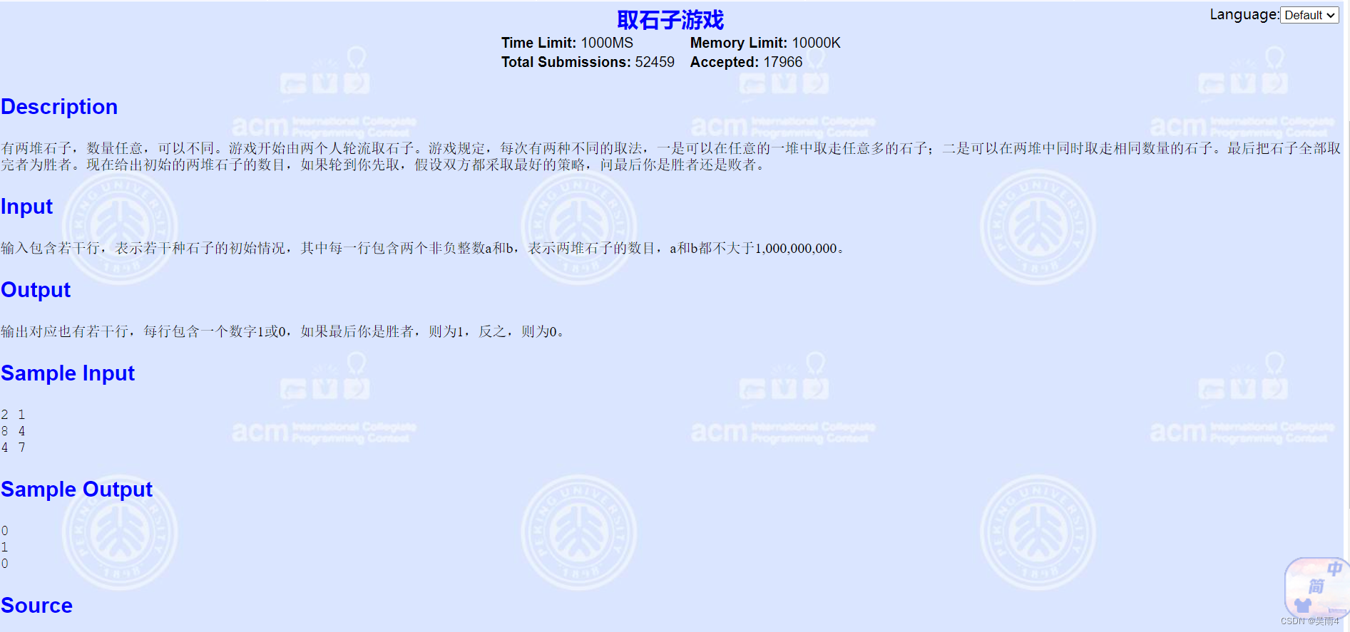 有两堆各若干个物品,两个人轮流从任一堆取至少一个或同时从两堆中取同样多的物品,规定每次至少取一个,多者不限,最后取光者得胜。