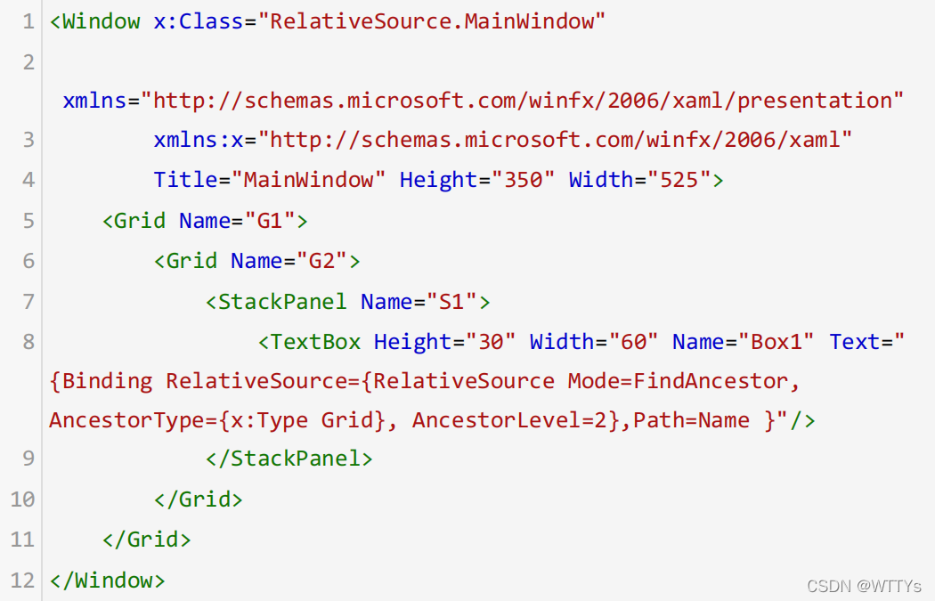 详细介绍下AncestorLevel,它指的是以Bingding目标控件为起点的层级偏移量,S1的偏移量是1,G2的偏移量是2,G1是偏移量3,AncestorType指的是要找的目标对象的类型。值得注意的是AncestorLevel必须参考AncestorType使用,如上面设置了AncestorType={x:Type Grid},则Bingding在寻找时会忽略非Grid的控件,此时G2的偏移量是1,G1的偏移量是2,StackPanel被忽略。