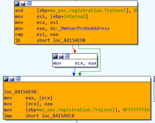 首先是校验边界,其次校验地址是否处于用户空间范围内(nt!MmUserProbeAddress其值由MiInitializeBootDefaults函数初始化):