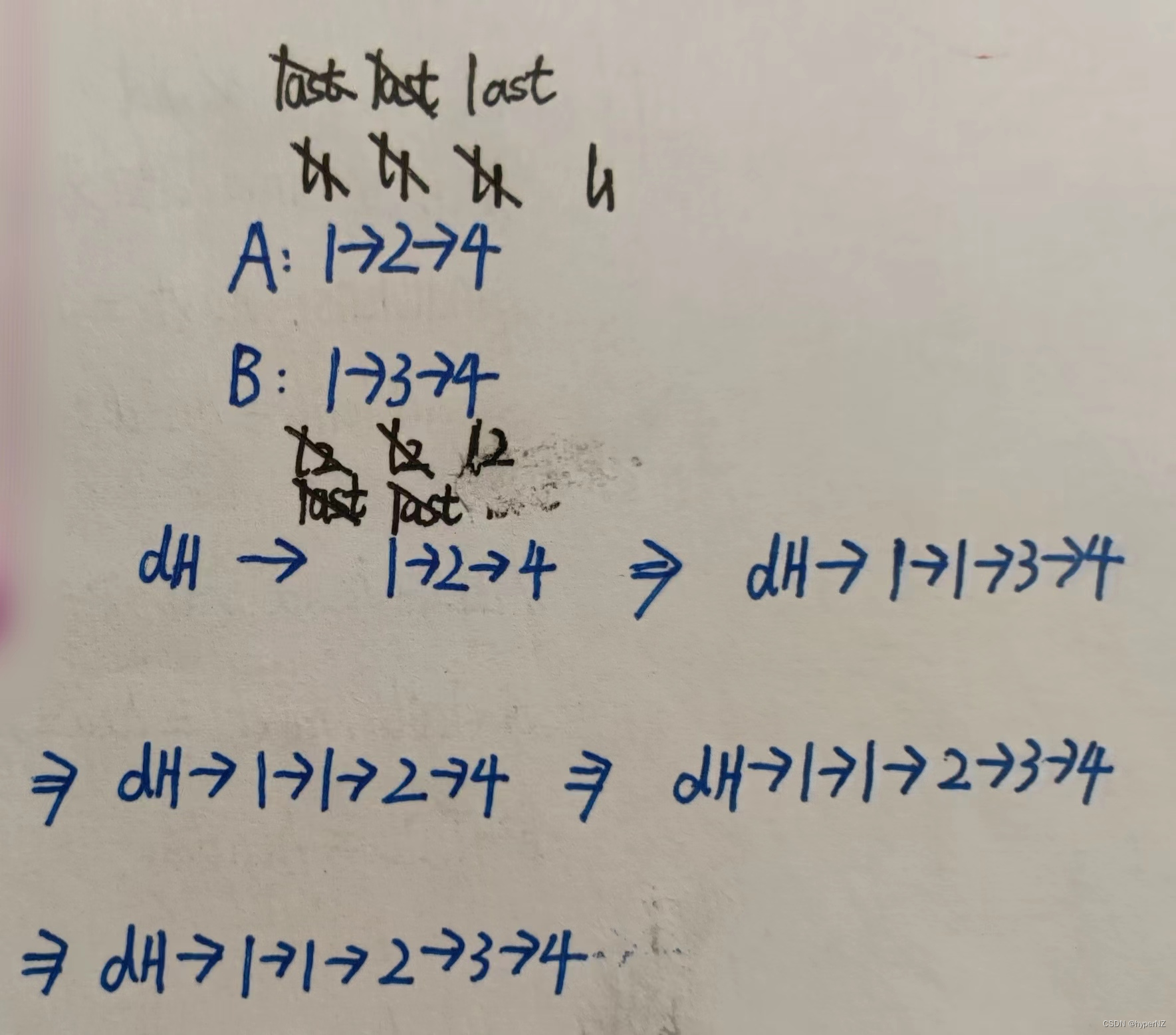 在不新增节点的前提下,拆散原来两个小链表,而后拼接新链表的l1,l2,last。