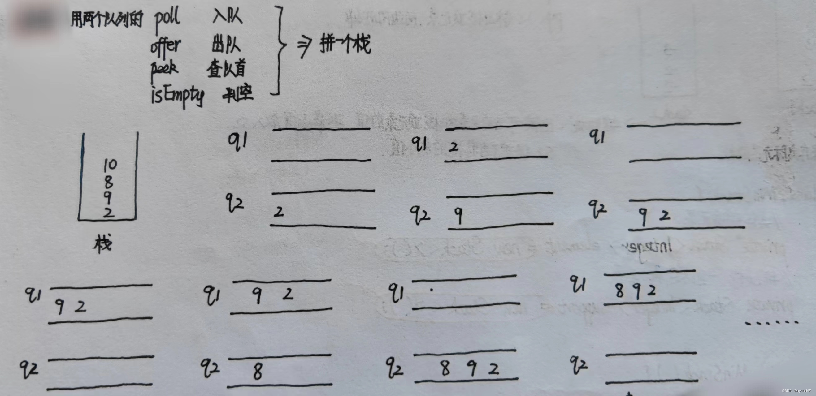- q2队列:作为辅助队列,每次添加元素之后保证q2为空。