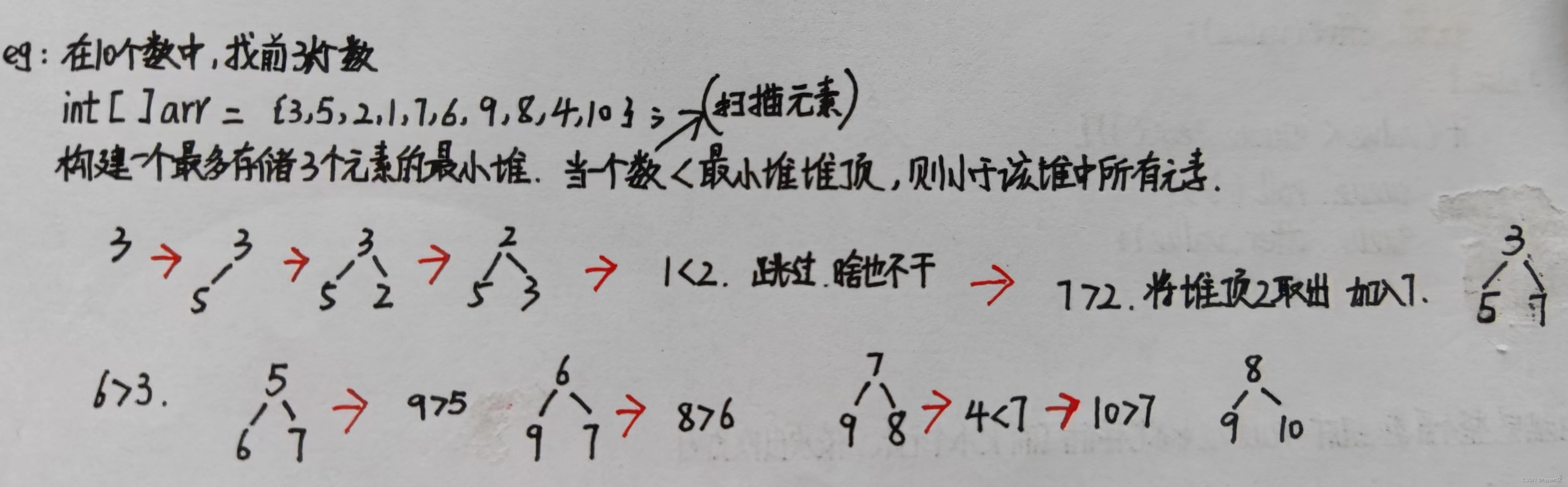 - 若扫描元素>堆顶元素,将当前堆中最小值(堆顶元素)换出,换一个更“优秀”的元素(扫描元素)进来。