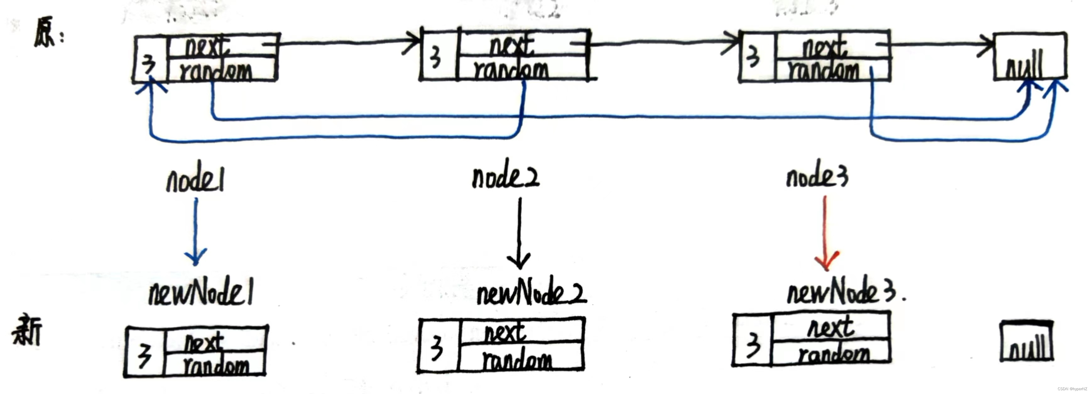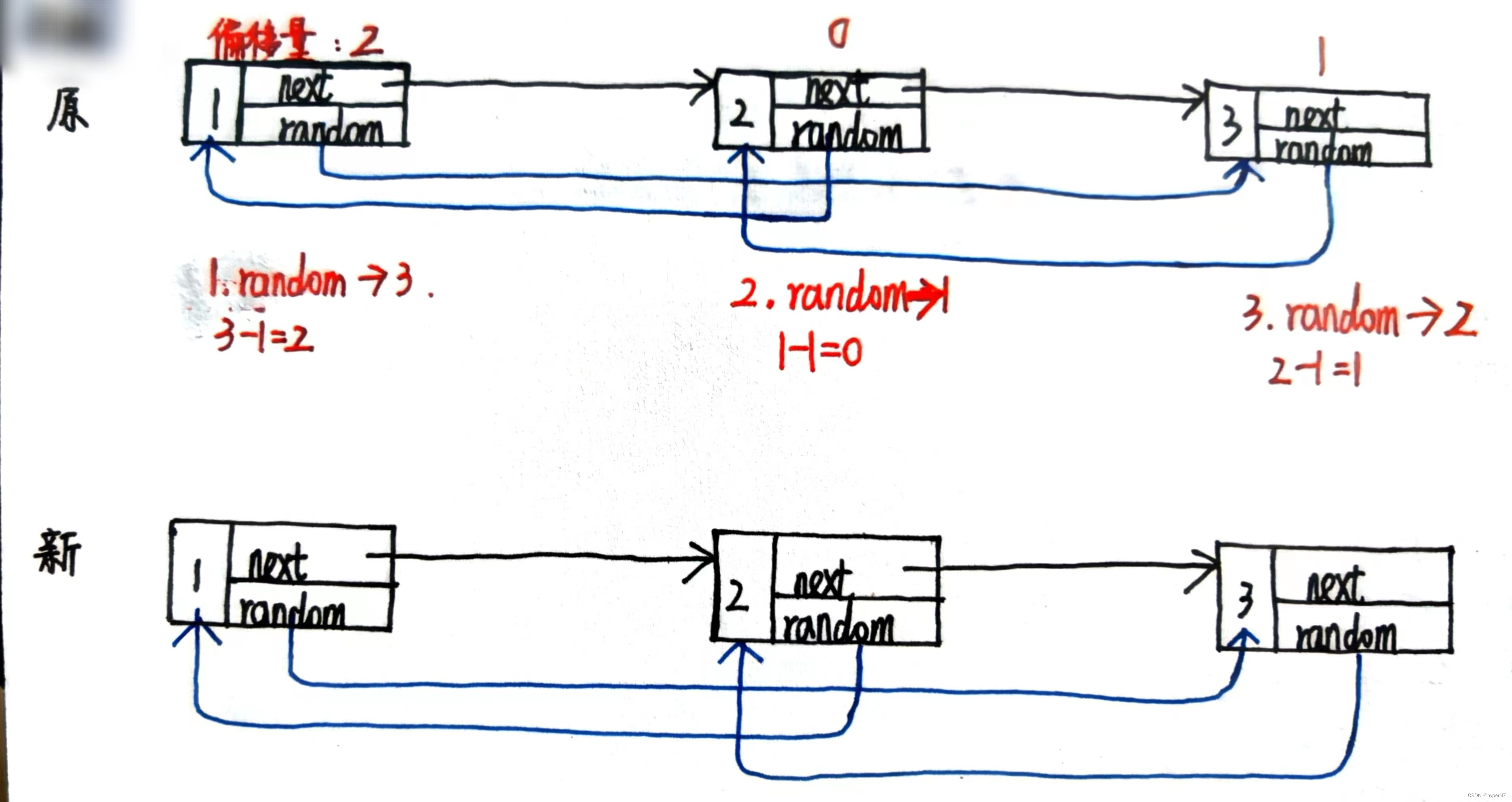 - 拿着每个节点的偏移量关系,就知道新的链表中random指向谁。