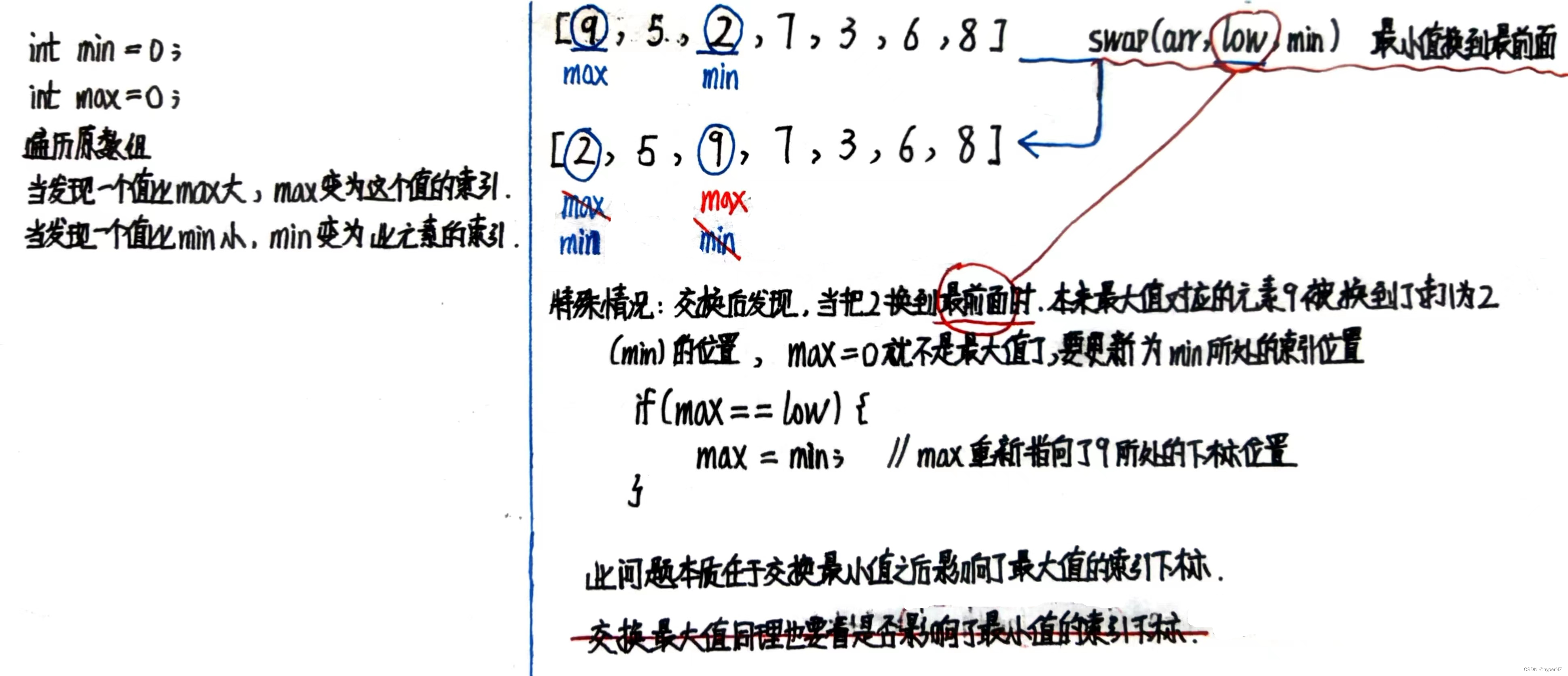 //当max就处在low的位置,由于swap(arr,low,min),low对应的元素值修改了,修改到min对应的下标