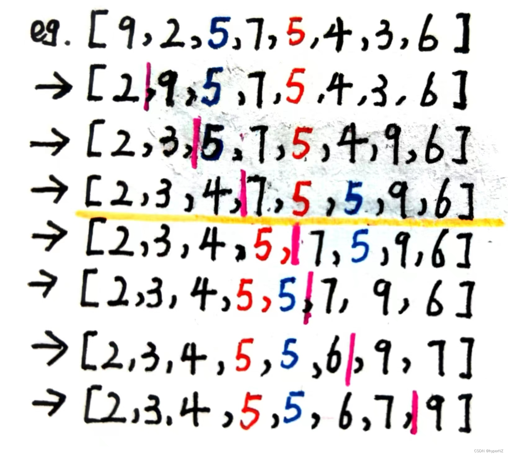 每次从无序区间选出最大/最小的一个元素,存放在无序区间的最后/最前面,直到全部待排序的数据元素排完。一趟下来只有一个元素到达最终位置。
