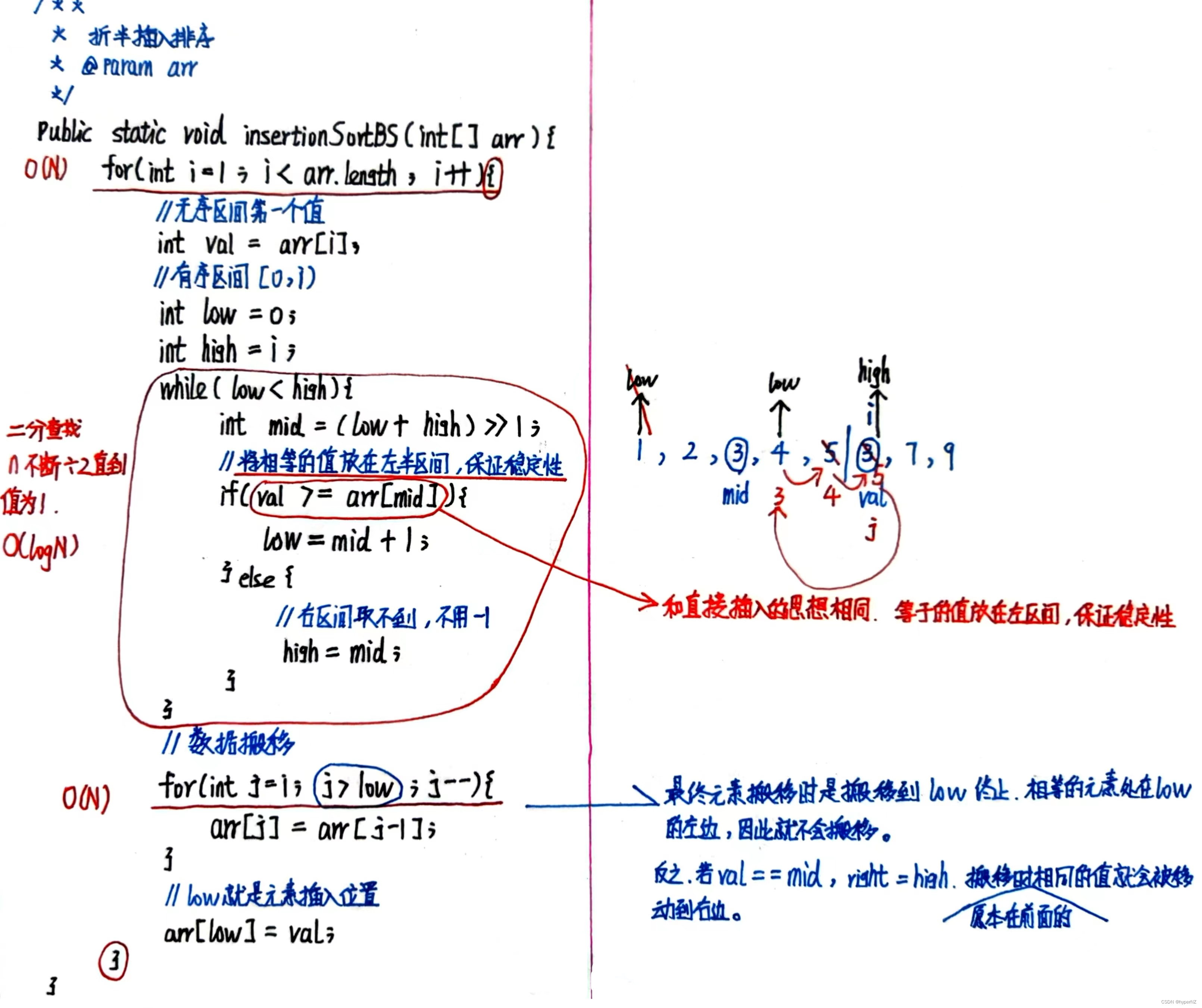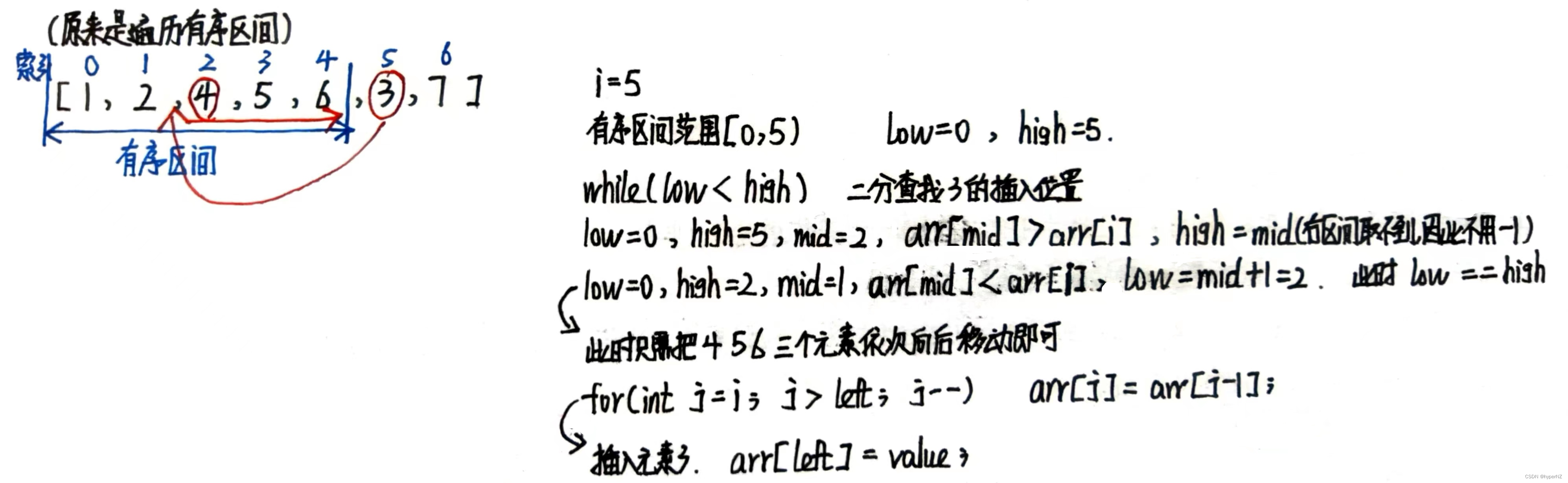 在有序区间选择数据应该插入的位置时,因为区间的有序性,可以利用折半查找(二分查找)的思想快速定位插入的位置。
