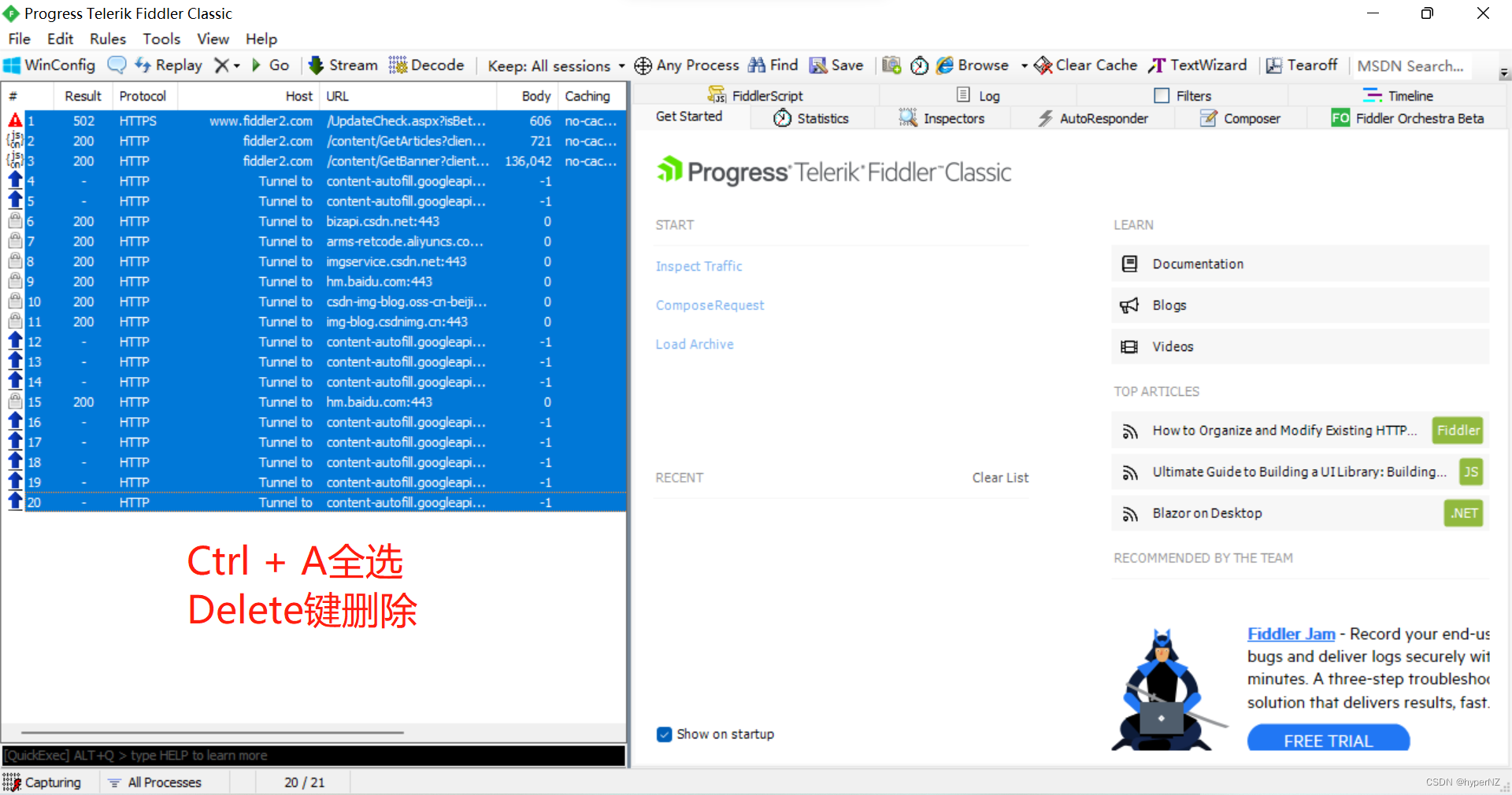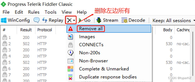 可以使⽤ ctrl + a 全选左侧的抓包结果,delete 键清除所有被选中的结果。