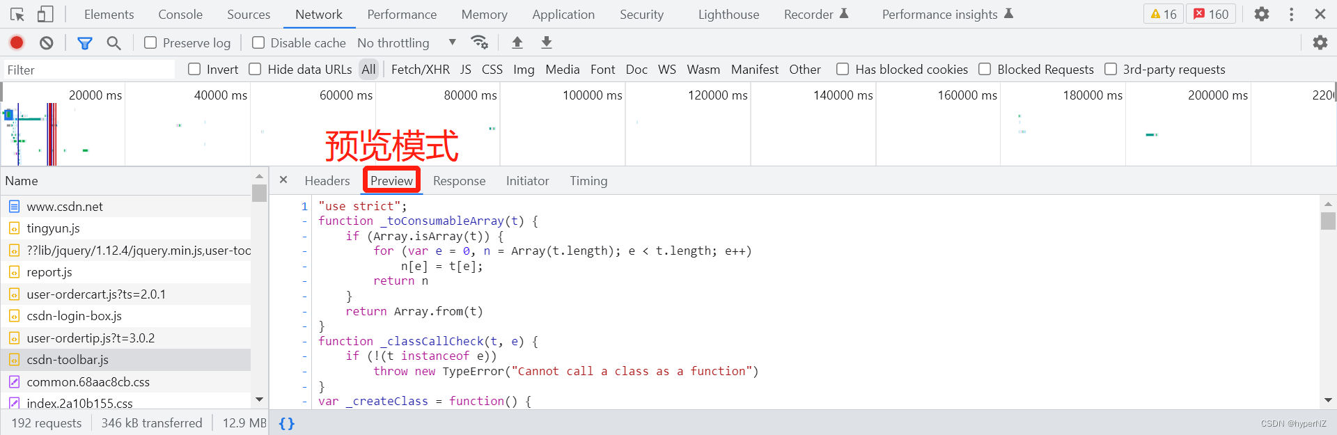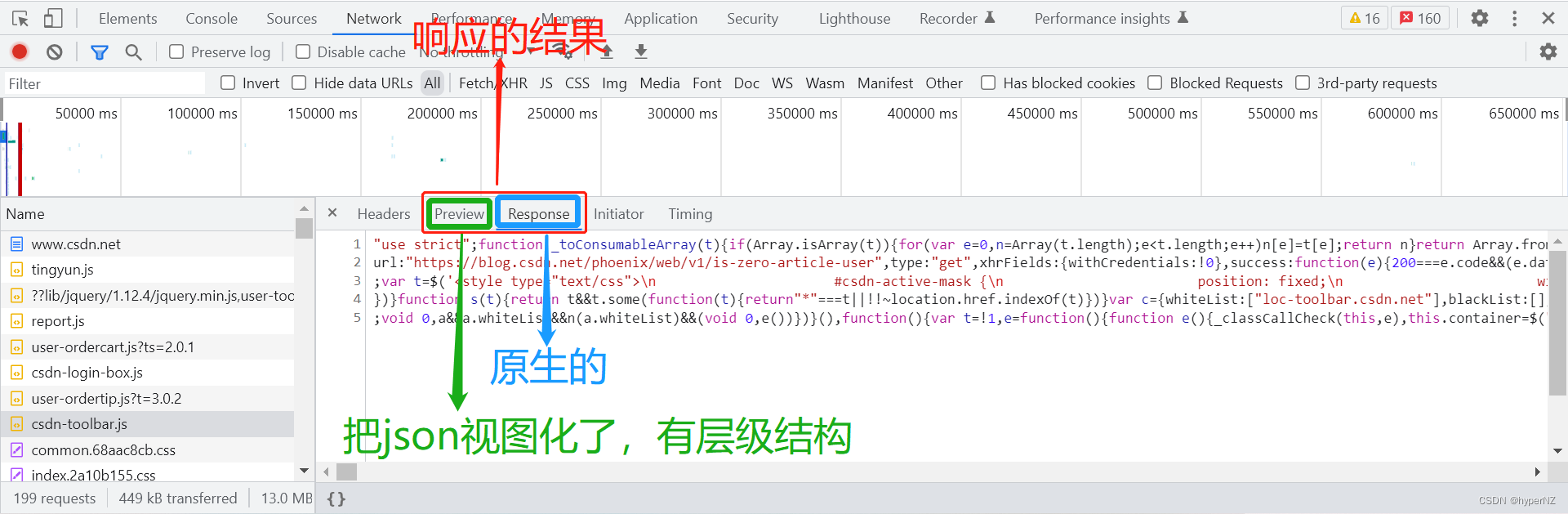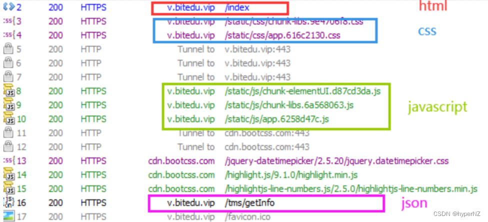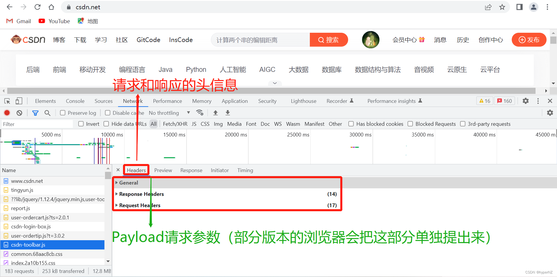 通过 F12 打开 chrome 的开发者⼯具,切换到 Network 标签⻚,然后刷新⻚⾯即可看到如下图效果。每⼀条记录都是⼀次 HTTP 请求/响应。